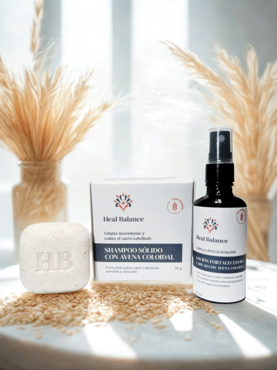Incluye: Shampoo Sólido con Avena Coloidal 70 g + Loción Fortalecedora Calmante Capilar 50 ml